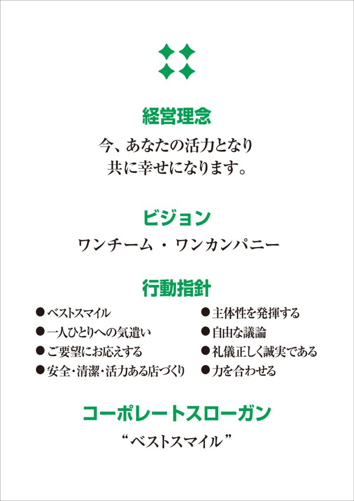 ・4つの緑色の星は四葉のクローバーを意味しており、理念『共に幸せになる』に向かって自ら幸せを見つけると言う意味が込められています。
